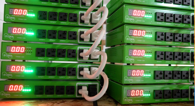 The TOWA Power Distribution Manager is a commercial smart charging system that distributes and rotates electrical load across multiple battery chargers on a single 120V/20A circuit without tripping breakers.